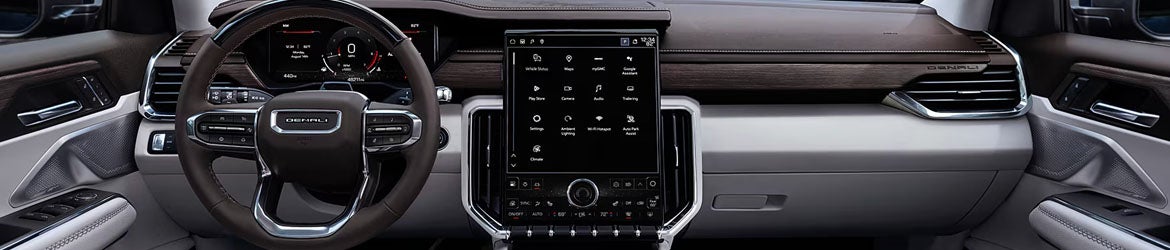 The cabin of the 2026 GMC Acadia Denali includes 3 rows of seating for passengers. The first and second rows feature leather-appointed surfaces, and the front seats include heating and ventilation functions. A 15" diagonal infotainment screen is positioned in the center of the dashboard to control various vehicle settings. Cargo space is adjustable because the third-row seats have a 60/40 power-folding design. The interior also provides 15" of total diagonal display area when measuring the primary screen.
